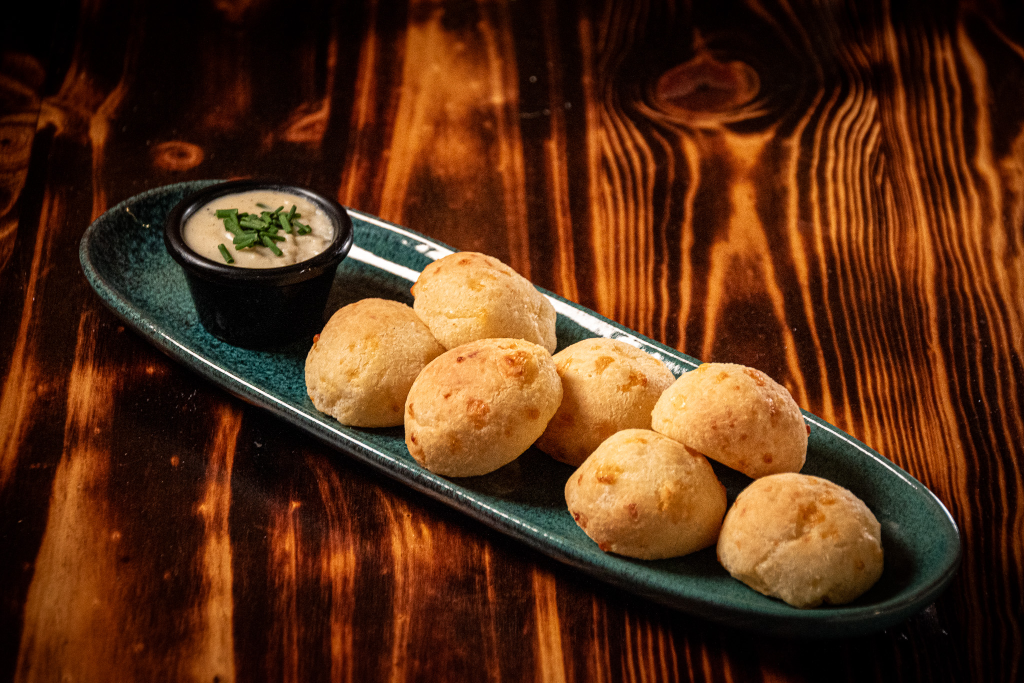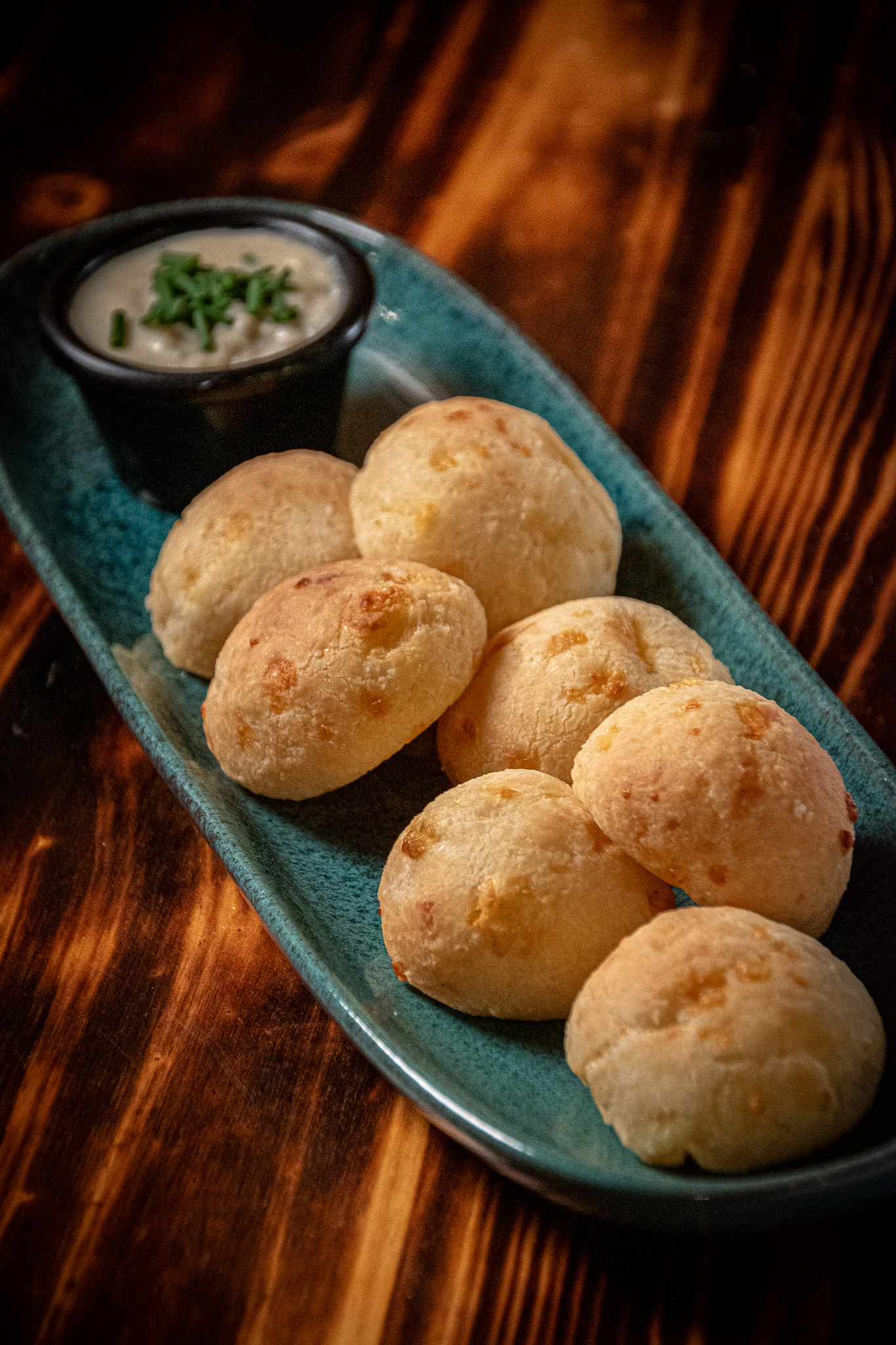Pão de queijo “pan de queso brasileño”, acompañado de crema de queso gorgonzola y brie.
