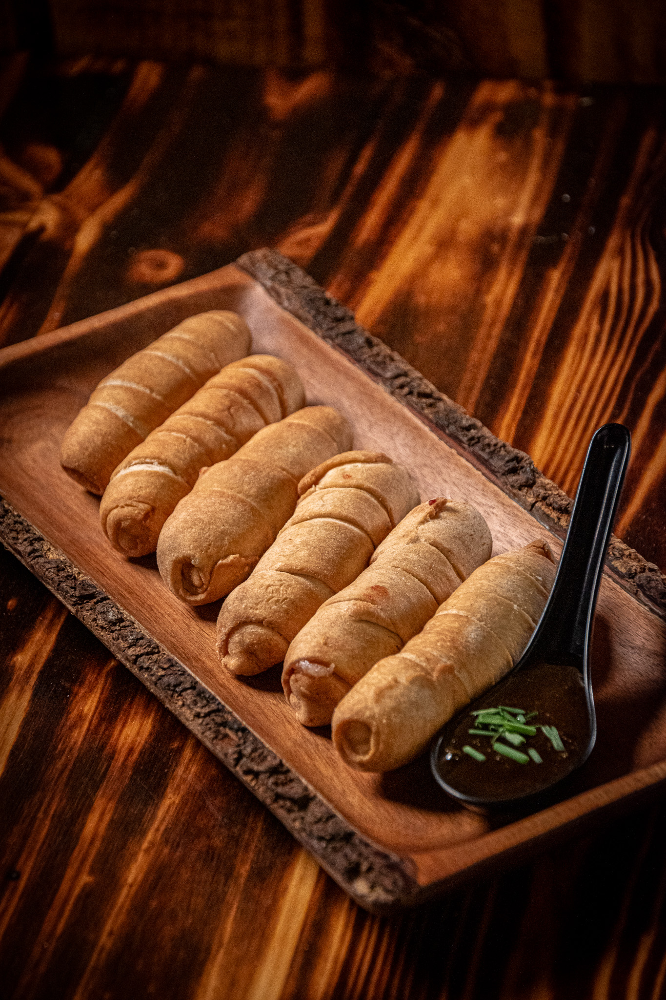bastones de yuca crujientes, reducción de panela y vino tinto, germinados de cebolla y salsa tártara vegana.