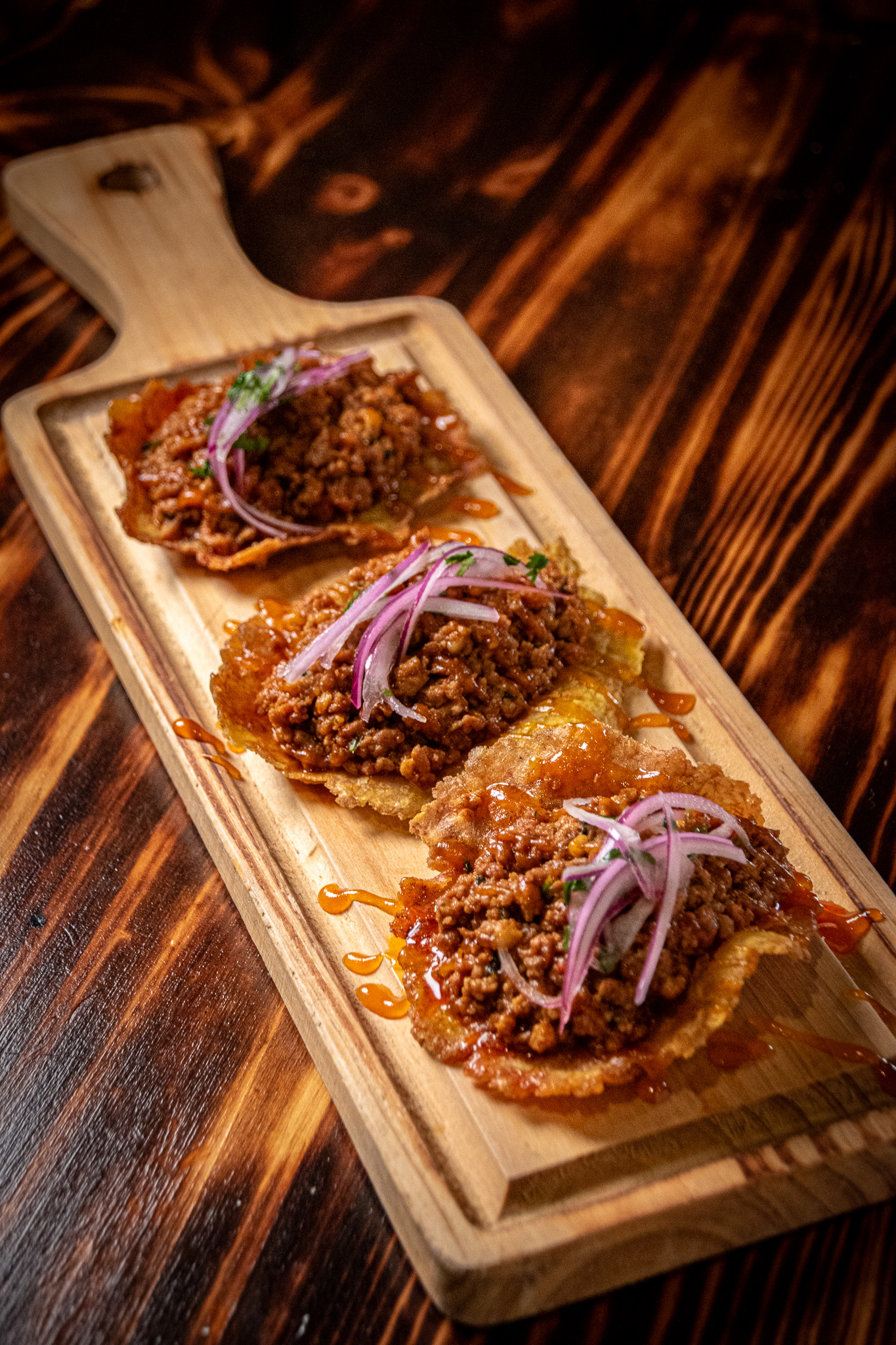 patacón de plátano macho crujiente, mishquina de chorizo fresco, salsa criolla y mermelada de ají amarillo.