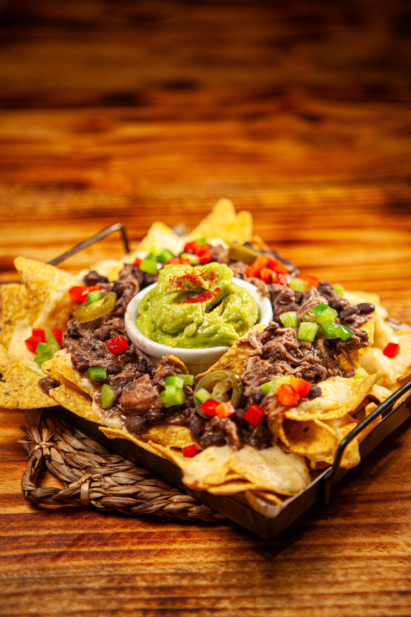 topotos “nachos” artesanales de maíz azul, gratinados con crema de queso fundido, jalapeños, pico de gallo, guacamole, carne mechada y feijoada.